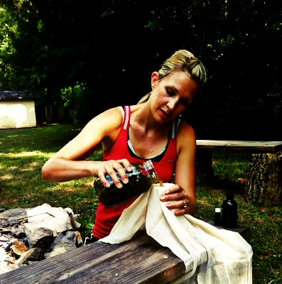 Put your cloth over the top of the jar to strain the leaves.